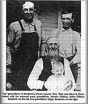 In 1835, Daniel Benjamin, a native of Jamestown, New York, came to Brunswick to look over the land. Daniel was part of a proud American family, already established. His father, Martin, was a soldier in the War of 1812. Daniel liked what he was and purchased 160 acres of land on what is now known as West 130th Street between Route 303 and Grafton Road. It cost $2.50 an acre from the Connecticut Land Company. He returned to New York where he wed Eliza Halbeit on January 20, 1836, and then proceeded to the new land by covered wagon. Exactly 99 years, 365 days later, his great-grandson, Elmer Benjamin, married his wife Theora and settled on the same land as his forefathers, where in 1987, they still remain. The first home on the site was a log cabin north of the present Benjamin home. Elmer's son Clayton lived there in a modern home for awhile and there was always a basement water problem. They found the modern building was atop of the spring used at the first cabin site. A frame building was built next on about the same site as the current Benjamin home. It was later turned into a horse barn when the "Big Home" was completed. That home, where Elmer was born, took two years to build. All of it was built by hand including doors and window frames. Daniel took two huge trees to Brooks' sawmill at Bennett's Corners. He traded one tree for the plants made from the other. All the beams are hand hewn and the wood shed, which is now a part of the home, was almost as big as the house - and as solid. It acted as both a wood storage building and a creamery in the summer. Daniel died at age 55, but Eliza, raising eight children, ran the farm and made a go of it. Daniel was more outgoing and fun-loving while Eliza was a strict churchwoman. One night, it's said, Daniel took his four daughters, the oldest of the eight children, to a dance in Hinckley. Eliza was so outraged at the frivolity that the next day she walked to a prayer meeting in Strongsville - many months pregnant. Eliza lived till almost the turn of the century. Eliza brought with her from New York, a clock which was built into a niche in the wall of the big house. It's said that the clock stopped running at the exact moment of her death, and hasn't run since. The Benjamins now own the clock which has wooden gears. ![]() On the maternal side of the family, it was great-grandfather Horatio Chidsey who was the "character." At the age of 75, Horatio decided to remarry. His first wife, Jeanette Greenwood, a former schoolteacher, had died. So Horatio took as his bride 25 year-old Alice Crumpler who was related to a former mayor of Strongsville. Horatio worked in Cleveland and became acquainted with John D. Rockefeller, who at one time lived in Strongsville. Horatio described John D. Rockefeller as the most homely man he'd ever met, in addition to being parsimonious. It's reported he ate only crackers and milk. John D. used to visit the Chidsey household, taking only a meal of graham crackers and milk, but always left a generous tip for the missus. Mrs. Chidsey was a teacher at Sherman's Corners School where she successfully succeeded three male teachers who had been bodily ejected by the students. Her approach was to ask the biggest, meanest young man in the school to be her helper. And she never had any trouble while be became a model student. Maternal grandfather J.T. Geckler was president of the Brunswick phone company. As president, he had to haul poles, dig holes, set the poles and wire them up. According to Elmer, Marie Fasoli was one of the last operators of the old system which only operated from 7:00 a.m. to 10:00 p.m. unless there was an emergency. The operator used to sleep on a couch near the switchboard in the off hours. Dennis Johnson was the only employee of the system other than the operators. He had to maintain the lines, install phones and even collect bills. Elmer's paternal grandparents were Edgar and Mary (Chidsey) Benjamin. Edgar was the seventh child of Daniel and Eliza and was the one who remained to work on the farm. Edgar and Mary had three sons, the middle of which, Clifford, was the one who stayed on the farm. He was Elmer's father. "My father was very upset when we encouraged our son Clayton to go on to school and leave the farm," Elmer recalled. "But we realized that times had changed and the land couldn't support a family any more." Theora came from the Lytle family who moved to Granger from their pioneer home in Geauga County. Her father was a blacksmith who had lost his wife. Her mother, seeking employment after her own widowhood, came to work as a housekeeper and ended up as Mrs. Lytle. They had three children of their own. In 1933, Theora graduated from high school and came to work in Brunswick at Zimmerman's store. Her sister is Mrs. Carl Zimmerman. Elmer paid the utility bills there and attended the same church. And that's how they met. 50 years ago they moved into the home in which they now live. Son Clayton was born in 1939 (the hospital bill was $43 for 10 days and another $50 for doctor's pre- and post-natal care). Nola was born in 1947. Times weren't always easy for the newlyweds. Theora remembers they went to the Berea Fair for an evening in 1938 - and didn't financially recover until after the winter had passed. The Benjamins worked the farm and raised chickens. Elmer had an egg route. Over the years, the Benjamins have found it necessary to sell most of the land, retaining just their property with one of the six homes built on the original land. The workload became too heavy for Theora who is afflicted with arthritis. Elmer couldn't be gone so much, so they sold the chickens (collected ceramic ones instead) and Elmer became an insurance agent and since retired. He and Theora are also notary publics. Elmer has a terrific memory for all sorts of things. Like how electricity came to his part of town: The owners of property there established the Bennett's Corners Illuminating Company in 1920. They hauled and